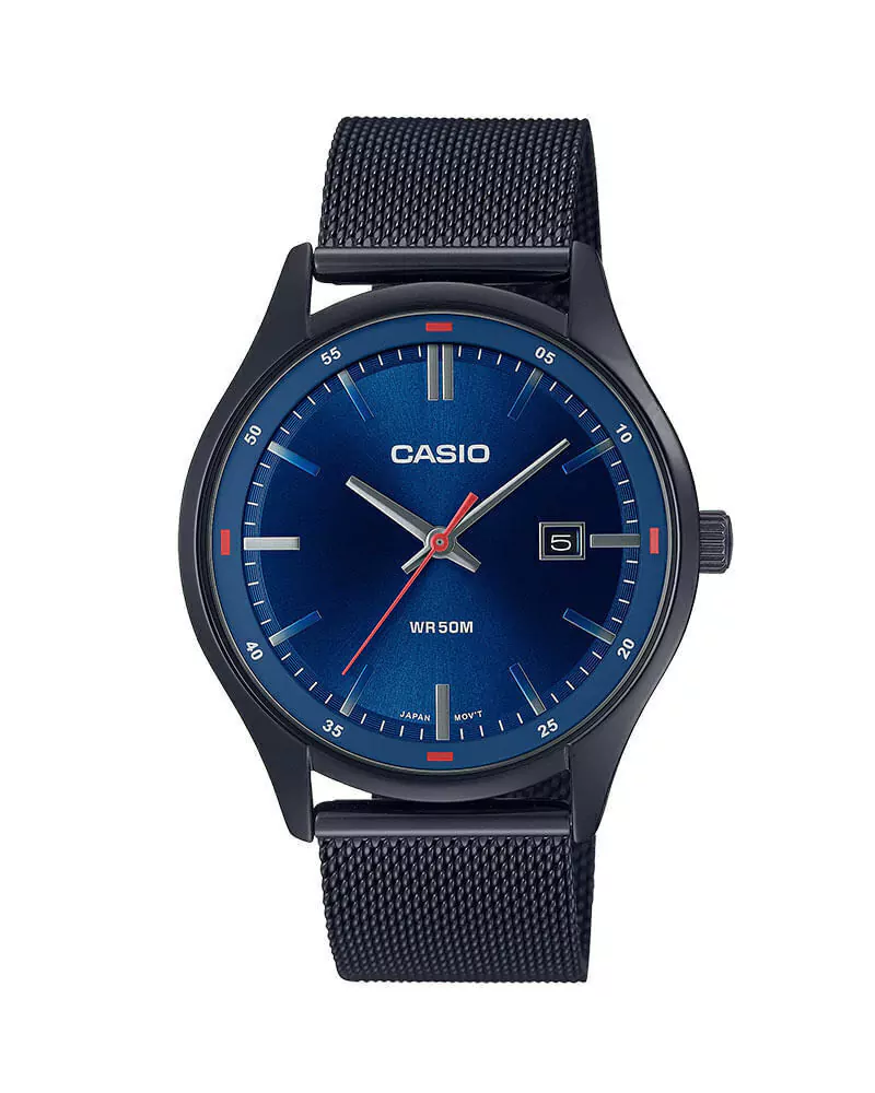 Resistente al agua 50 m. Caja de acero y malla de acero tejido de fácil ajuste,con baño de iones en negro. Calendario.