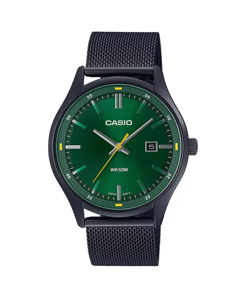 Resistente al agua 50 m. Caja de acero y malla de acero tejido de fácil ajuste,con baño de iones en negro. Calendario.