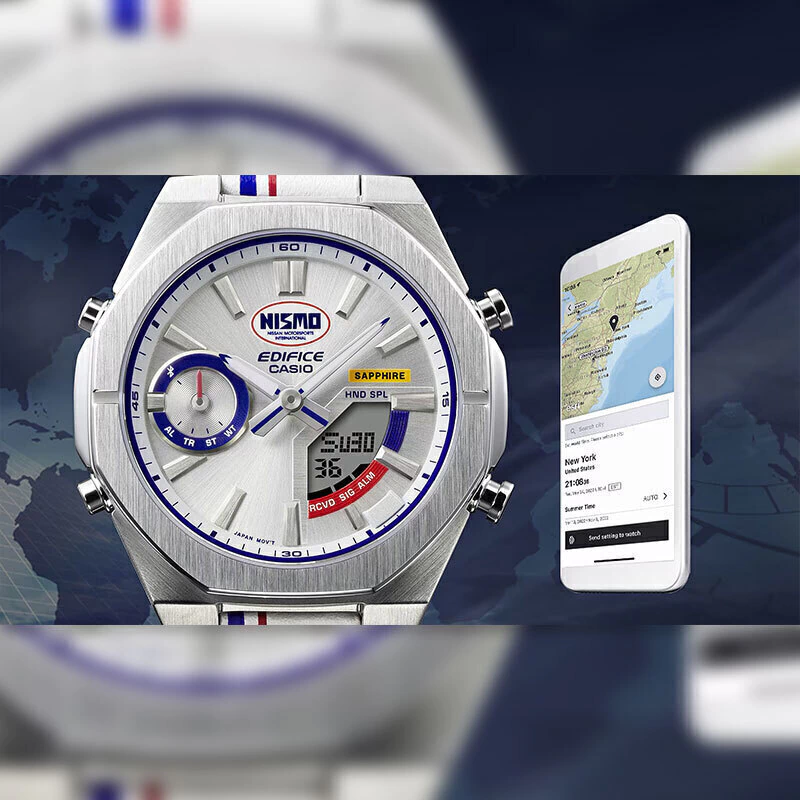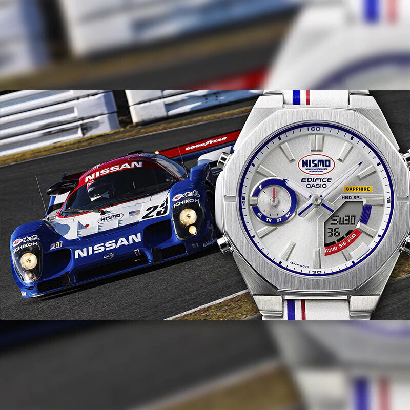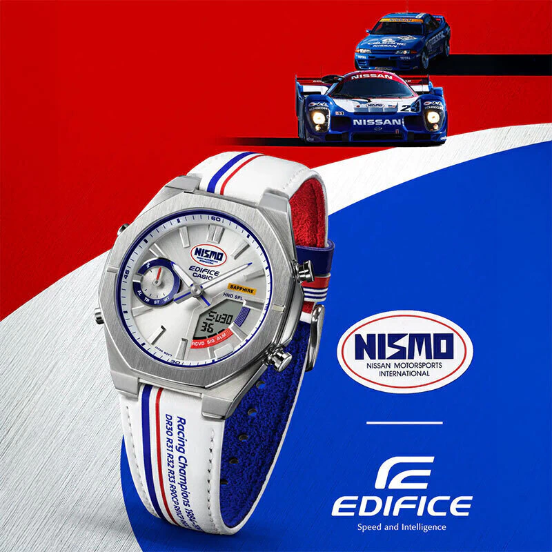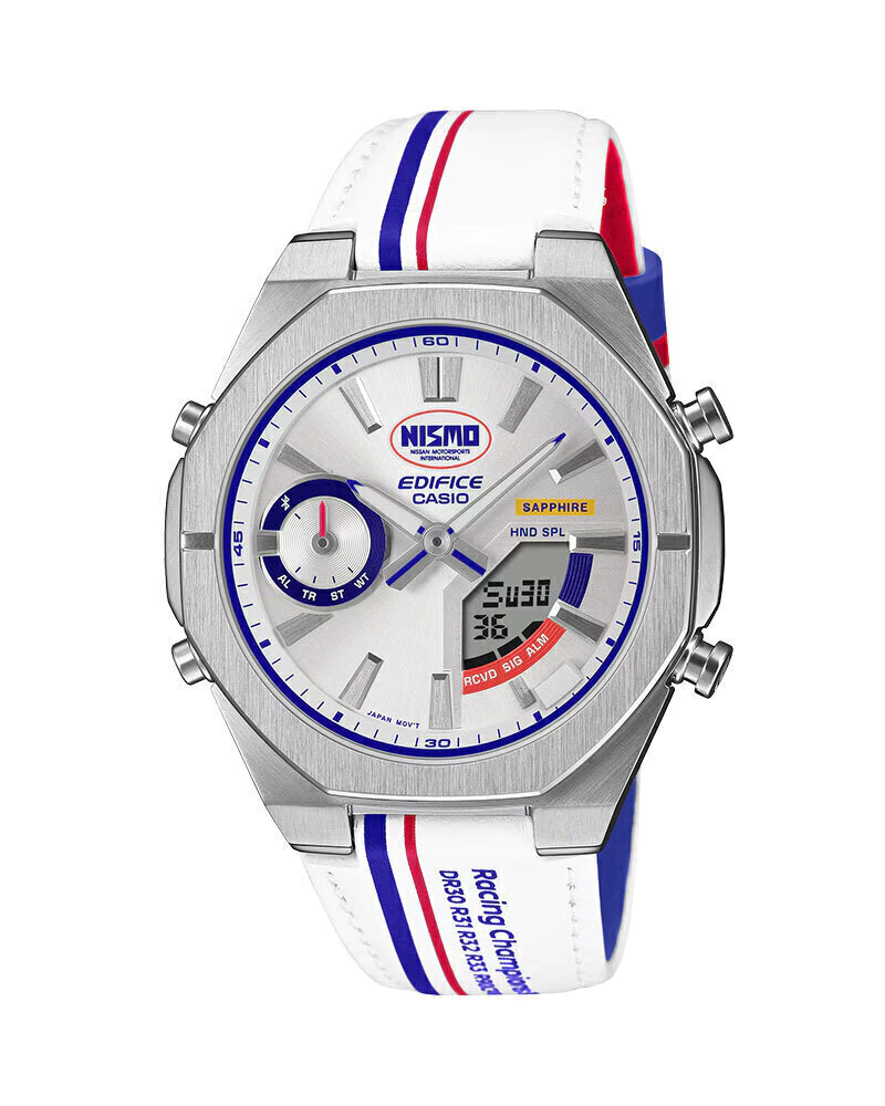 Este EDIFICE especial rinde homenaje al legado de NISMO, el equipo de competición de Nissan, con un diseño cargado de historia y detalles únicos. El reloj presenta el logo NISMO original en la esfera y la correa, ambos acompañados por el característico diseño tricolor del equipo. El azul y el rojo del esquema se repiten en la parte inferior de la correa, mientras que las rayas del uniforme NISMO original se reproducen en la presilla.