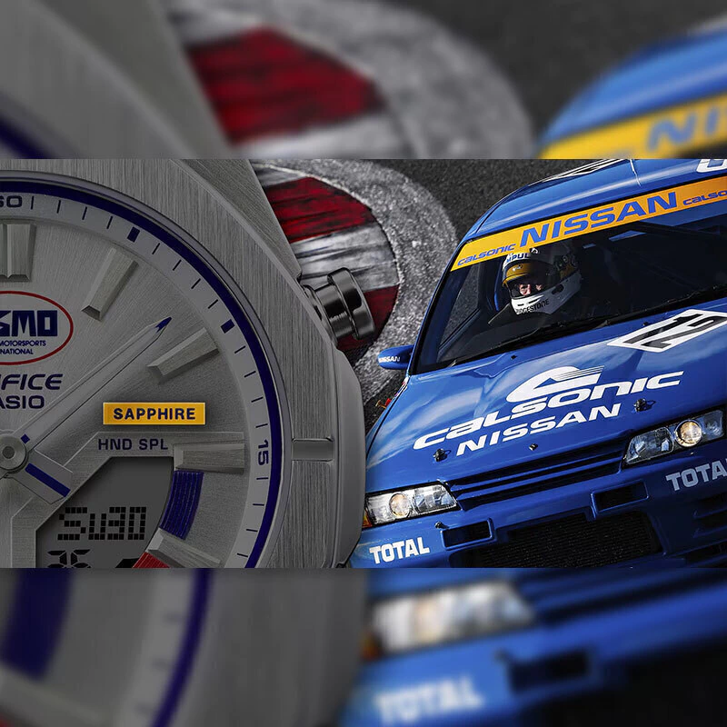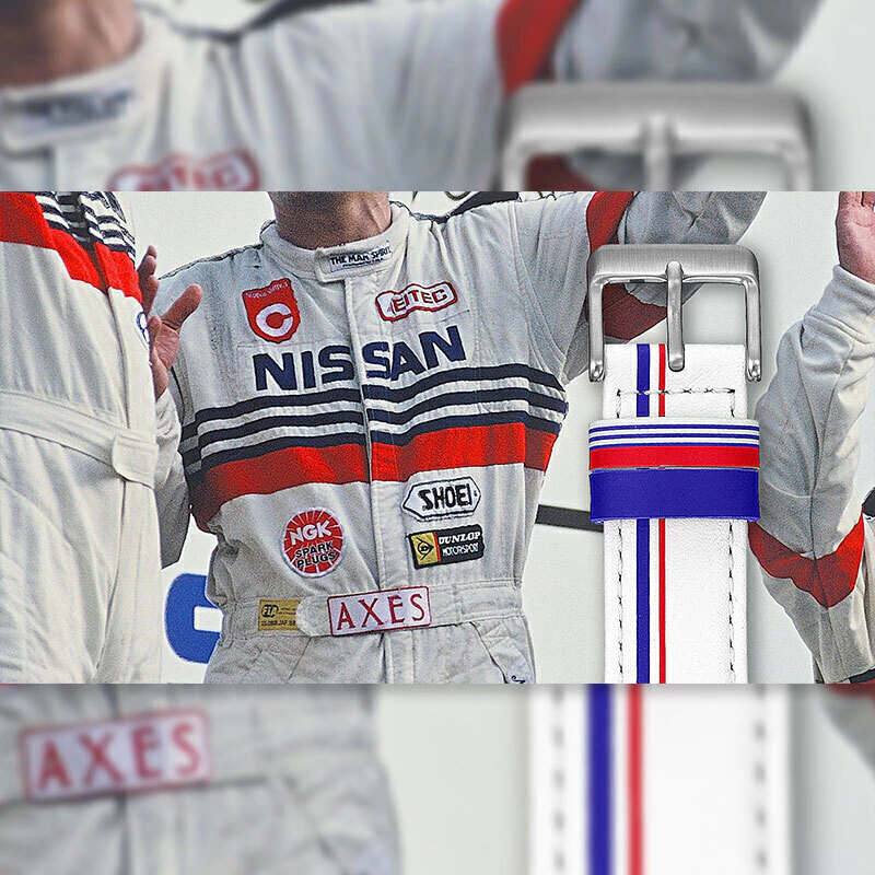 La correa incluye impresos los nombres de los campeones NISMO entre 1984 y 1997, celebrando tanto a los legendarios autos de carrera como al equipo que los llevó a la gloria. El logo ubicado en la parte superior central de la esfera brilla en la oscuridad, evocando los números fluorescentes de los autos del Grupo C que competían en las exigentes carreras de resistencia de 24 horas. El diseño se completa con la bandera naranja del parabrisas del Nissan Skyline R32 integrada en la esfera.