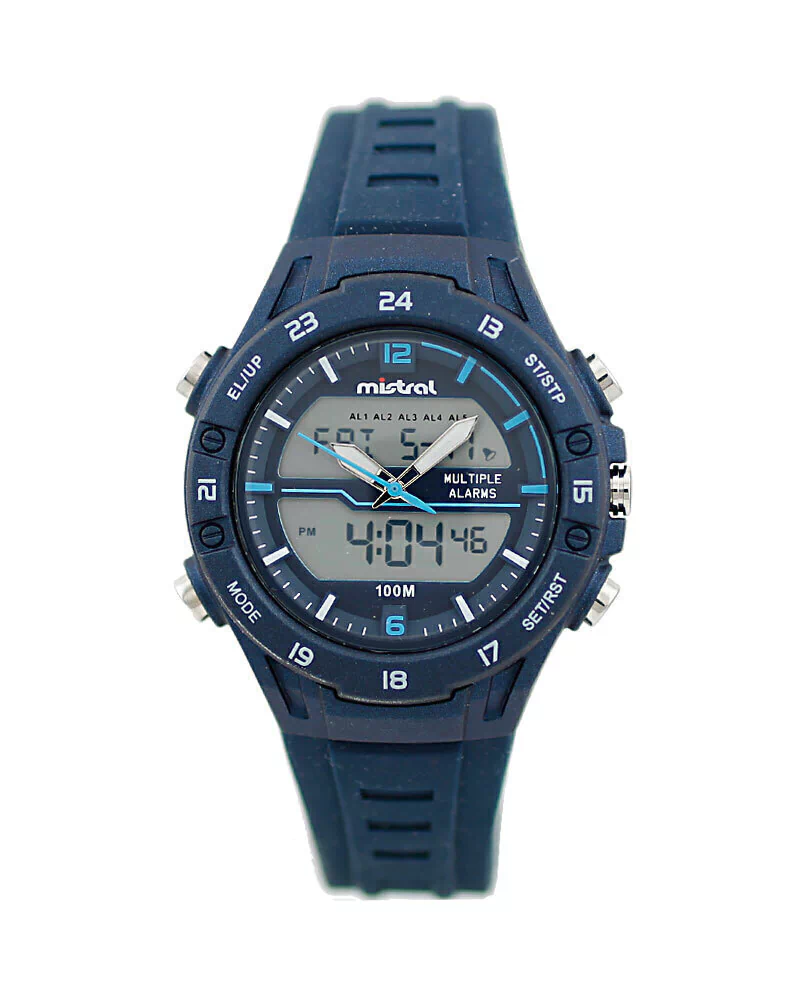 Doble hora, digital y análoga, cronometro, timer de cuenta regresiva, 5 alarmas, hora dual. Sumergible 100M.