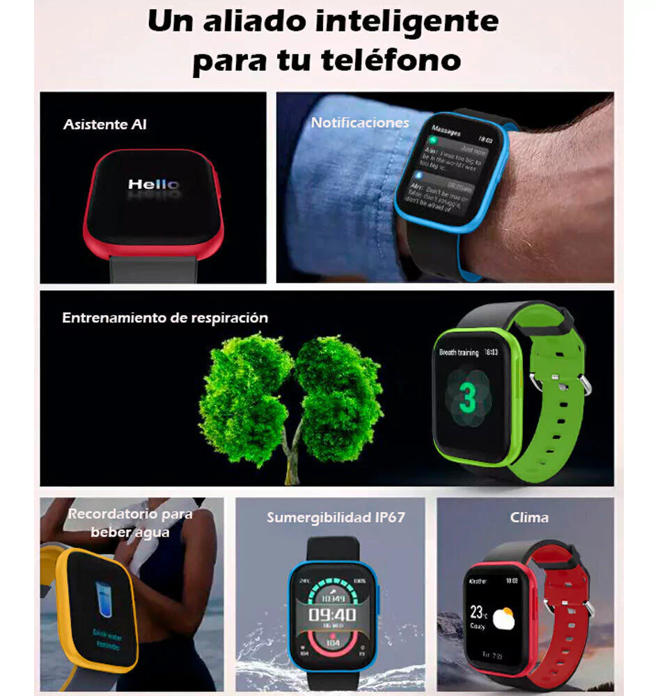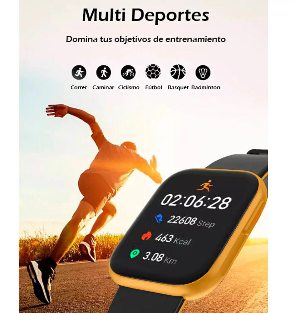 FUNCIONES: ALARMA, FECHA, CLIMA, MODO NO MOLESTAR, ASISTENTE DE VOZ, FUNCION DE BUSCAR, CRONOMETRO, MODO MULTIDEPORTE: CORRER, TREPAR, BICICLETA, TENIS, BASKET, FOOTBALL, ETC).